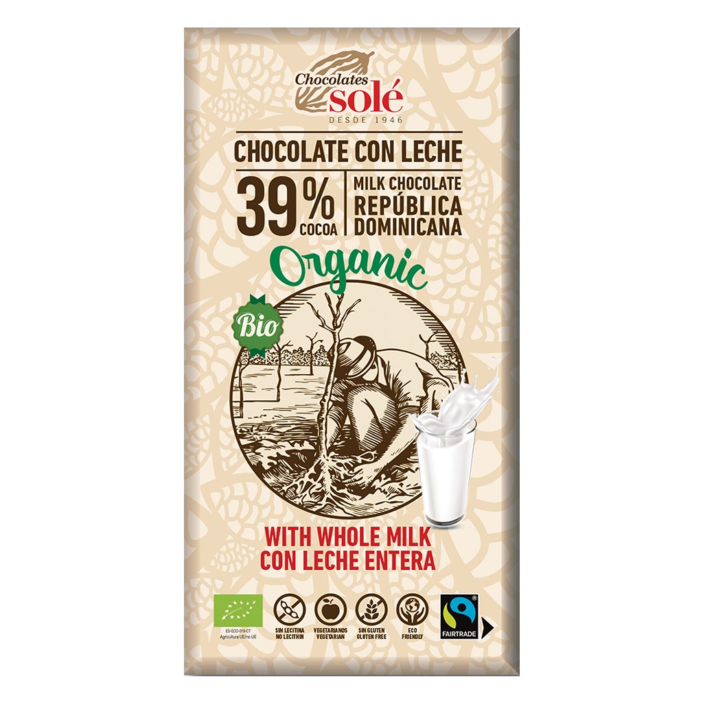 Jemná mléčná čokoláda s vysokým obsahem kakaa, slazená přírodním třtinovým cukrem z Brazílie. Je krémově jemná a plná kakaové chuti. Typickou vůni jí dodává čistá vanilka. Bio čokolády značky SOLÉ na sobě nesou logo FAIR TRADE. Fair trade - spravedlivý obchod - garantuje farmářům z rozvojových zemí spravedlivou odměnu a zakazuje otrockou a dětskou práci.