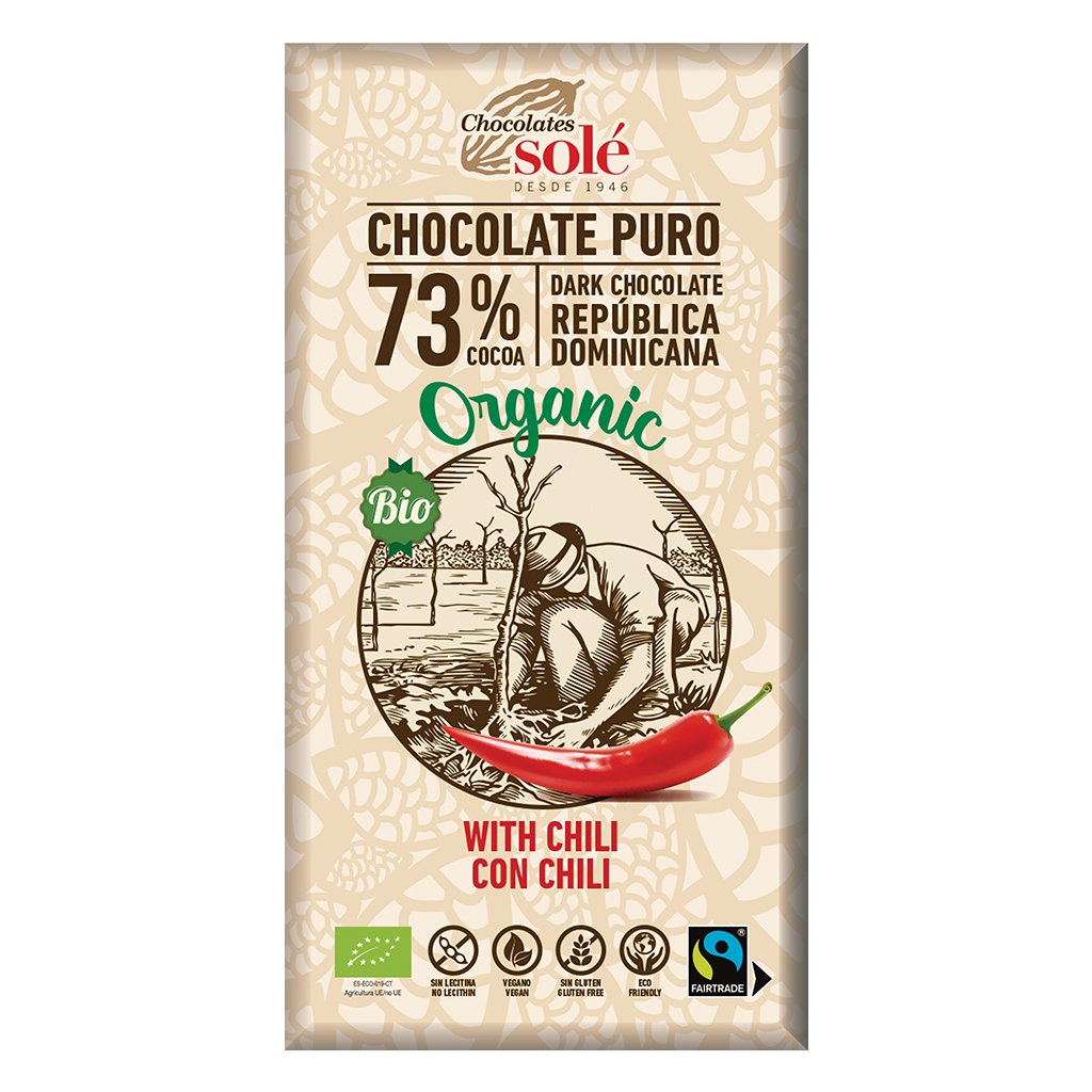 Tato jedinečná čokoláda obsahuje vysoký podíl špičkového dominikánského kakaa (73 %) a přírodní třtinový cukr z Brazílie. Ochucená je sušenou chilli papričkou a neobsahuje žádné emulgátory. Bio čokolády značky SOLÉ na sobě nesou logo FAIR TRADE. Fair trade - spravedlivý obchod - garantuje farmářům z rozvojových zemí spravedlivou odměnu a zakazuje otrockou a dětskou práci.