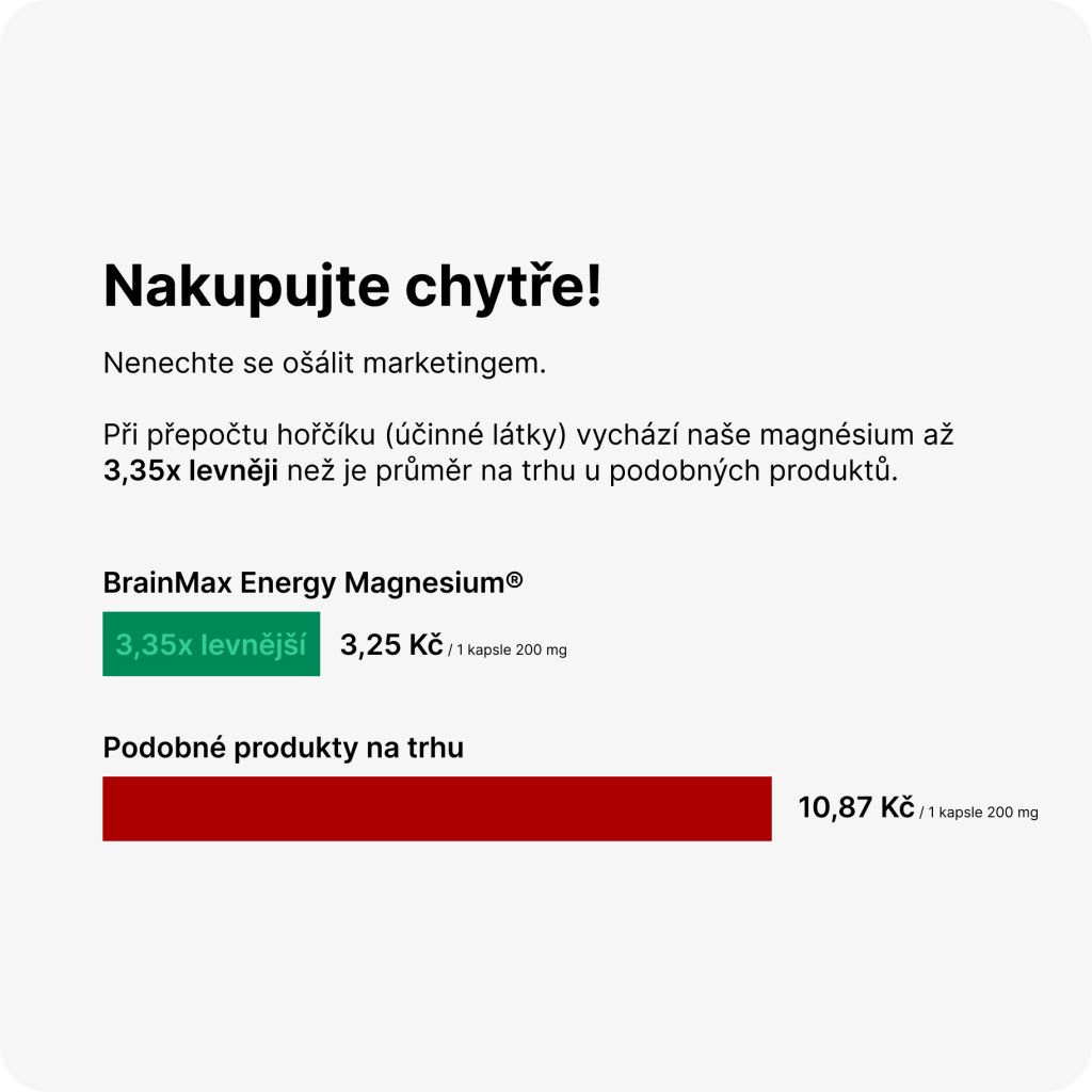 Kupuj mądrze i nie daj się zwieść marketingowi. W przeliczeniu na magnez (substancję czynną), nasz magnez jest nawet 3,35 razy tańszy niż średnia cena rynkowa podobnych produktów. BrainMax Energy Magnesium® kosztuje tylko 3,25 CZK za 1 kapsułkę (1000 mg), podczas gdy średnia cena podobnych produktów na rynku wynosi 10,87 CZK za 1 kapsułkę (1000 mg).