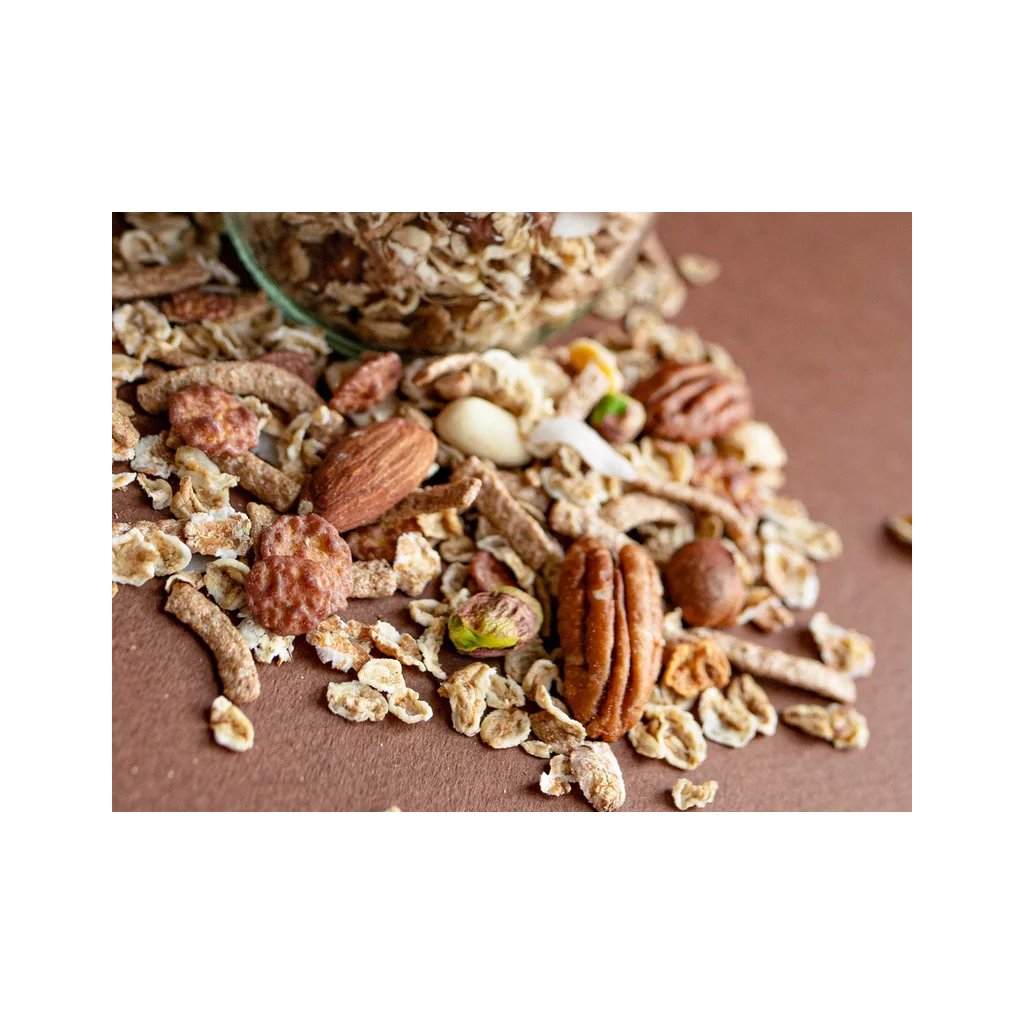 płatki owsiane, błonnik (otręby pszenne 41,5%, mąka pszenna pełnoziarnista 17,6%, błonnik kukurydziany 15,5%, cukier, glukoza, skrobia kukurydziana, emulgator: lecytyna słonecznikowa; ekstrakt słodowy jęczmienny, olej słonecznikowy z rozmarynem (olej słonecznikowy, przeciwutleniacz: ekstrakt z rozmarynu), cynamon 0,3%, naturalny aromat miodu, substancja mineralna: węglan wapnia), płatki pszenne, płatki kukurydziane w mlecznej czekoladzie (mleczna czekolada 56% (cukier, masło kakaowe, pełne mleko w proszku, masa kakaowa, emulgator: lecytyna; naturalny aromat wanilii), płatki kukurydziane 42% (kasza kukurydziana, cukier, sól, ekstrakt słodowy jęczmienny, barwnik: węglany wapnia), substancja glazurująca: guma arabska; cukier, miód), orzeszki ziemne, płatki kukurydziane w białej czekoladzie (biała czekolada 56% (cukier, masło kakaowe, pełne mleko w proszku, proszek śmietankowy, emulgator: lecytyny; naturalny aromat wanilii), płatki kukurydziane 42% (kasza kukurydziana, cukier, sól, ekstrakt słodowy jęczmienny, węglan wapnia), substancja glazurująca: guma arabska; cukier, miód), wiórki kokosowe 6%, ziarna migdałów 5%, ziarna orzechów laskowych 4%, ziarna pekan 3%, łuskane pestki pistacji 2%